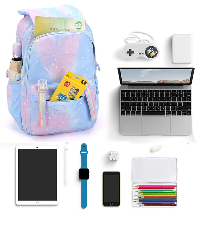 Avec ses dimensions généreuses de 30 x 22 x 44 cm, ce cartable offre un espace suffisant pour accueillir tous les essentiels scolaires : cahiers, livres, trousse, goûter, tablette... Les pochettes latérales permettent d’y glisser une gourde ou un parapluie, rendant ce sac aussi pratique que mignon ☔🧴.